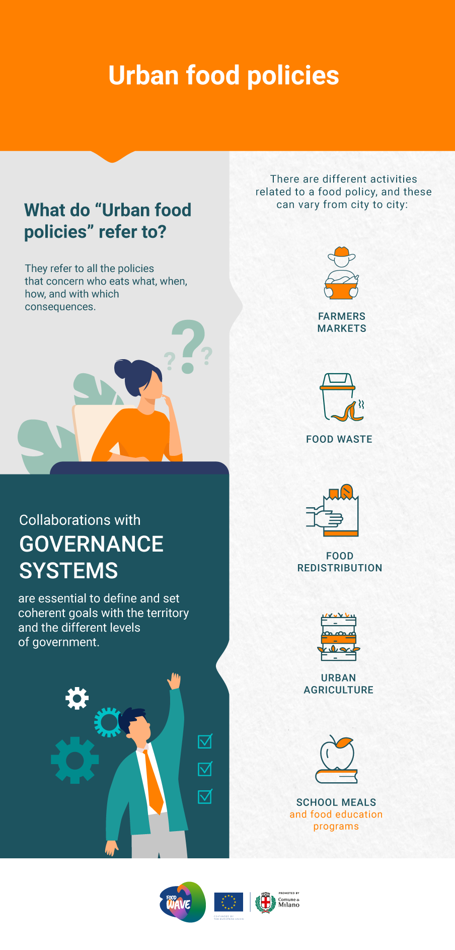Urban food policies protect and regulate guidelines for who eats what, when, how and with which consequences. New activities and governance systems guarantee the perfect functioning of these policies for urban citizens.
